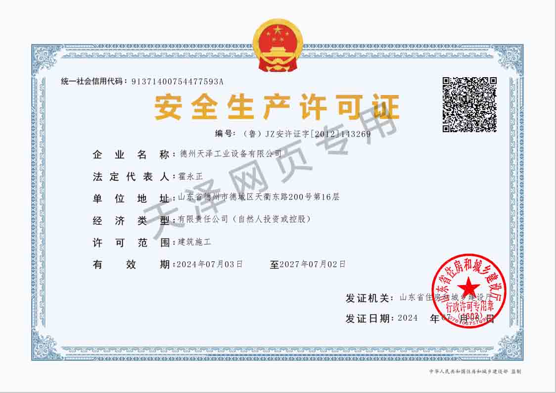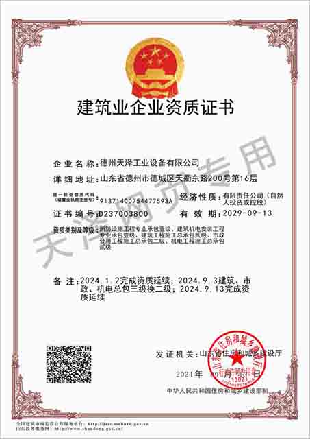 德州天澤工業設備有限公司成立于2003年(前身為德州天元集團天明工業設備安裝公司),經過20多年的發展,現成長為擁有職工600余人,各類專業技術人員近300余人,年生產能力兩億元以上,以建筑機電安裝工程、消防設施安裝工程施工為主,集建筑工程施工、市政工程施工、建筑智能化工程施工、園林綠化工程施工、工程管理服務、物業管理、電氣機械設備銷售等多元化經營于一體的綜合型企業。2005年,企業按照國際標準建立的質量管理體系,通過了ISO質量管理體系認證、環境管理體系認證、職業健康安全管理體系認證。施工工程遍布山東、河北、四川、江蘇等地,最具代表性的工程有:山東省德州市百腦匯資訊廣場機電安裝工程、德州經濟開發區天元大廈機電安裝工程、陵城區人民醫院機電安裝工程、德州金魯班大廈機電安裝工程、河北故城金辰小區機電安裝工程、北川地震災后援建工程等。多年來,公司始終堅持“以人為本,建精品工程,創行業品牌”的經營理念,先后榮獲。ㄊ校┘壧┥奖⑻旄Ⅳ敯脖泉勴,申報各種功法、多項專利。